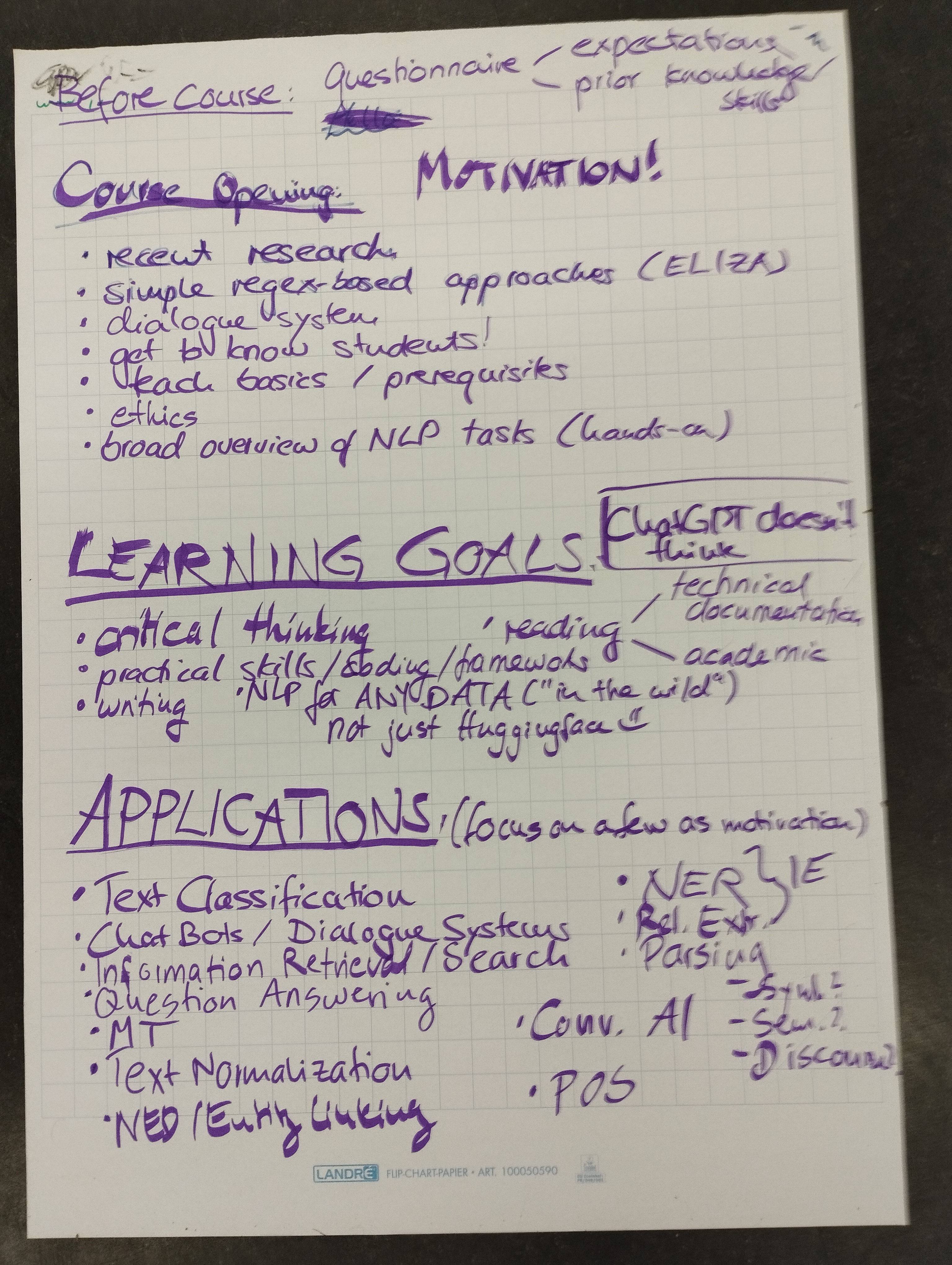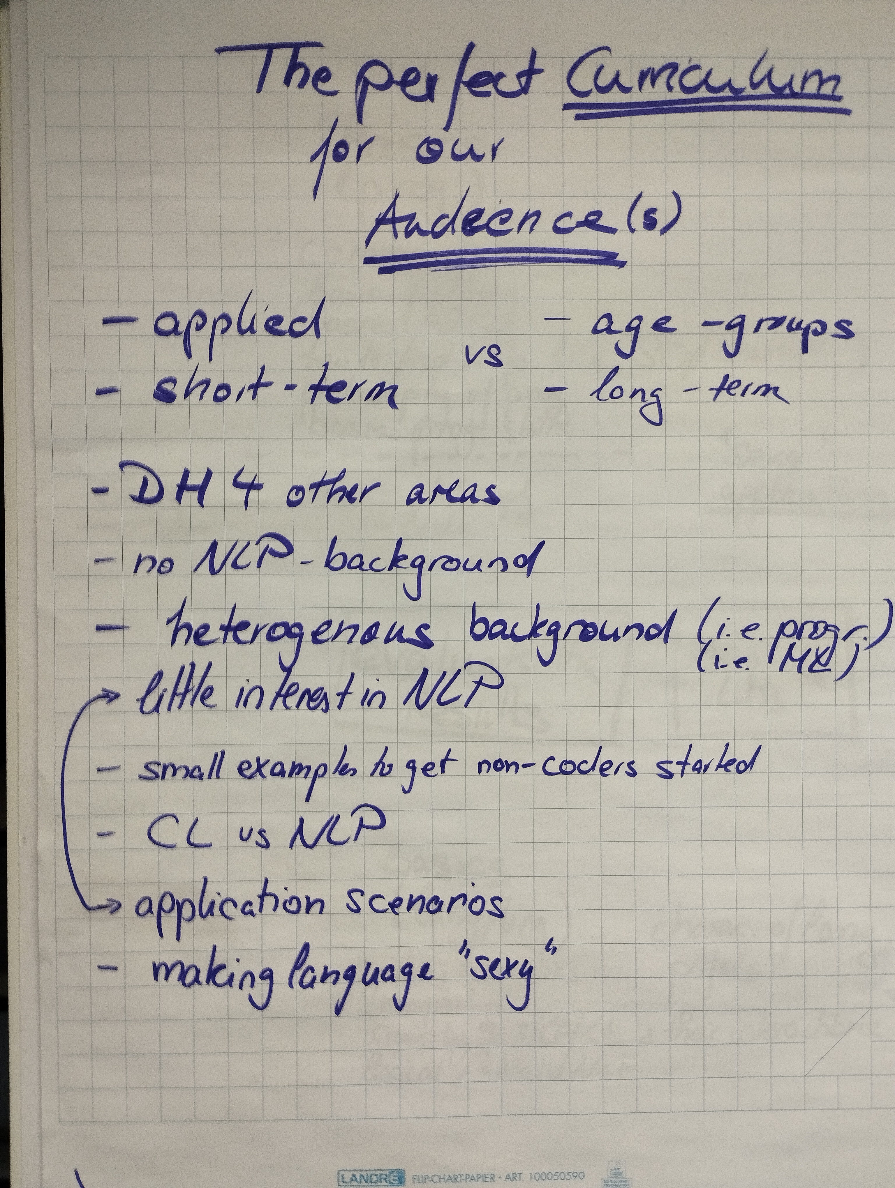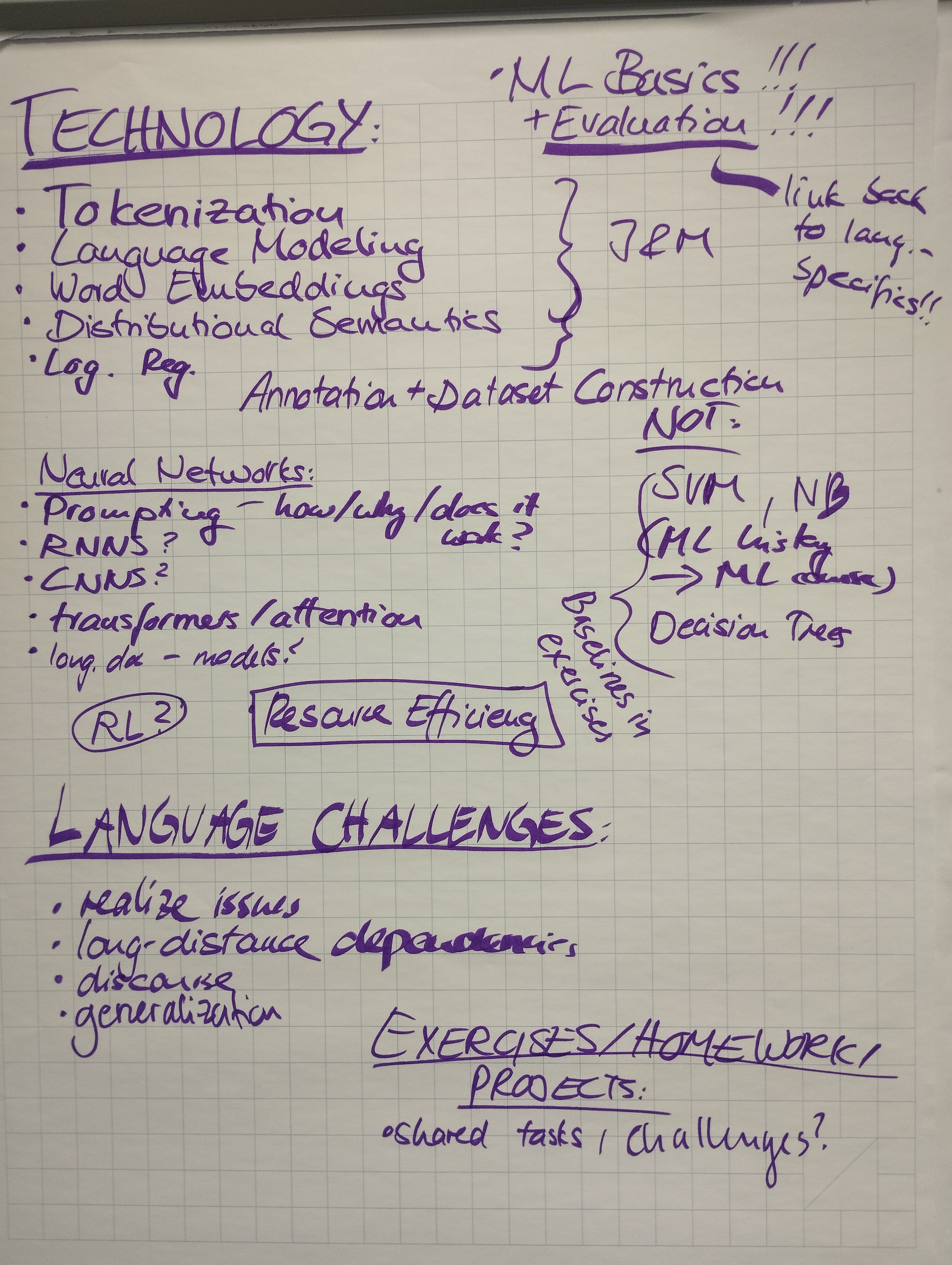 Der Workshop bestand aus offenen Diskussionsrunden und Ad-hoc-Präsentationen. Die Teilnehmer diskutierten darüber, was zu einem “perfekten NLP-Lehrplan” gehören sollte (man beachte die Ironie), über die besonderen Herausforderungen beim Unterrichten von heterogenen Gruppen oder von Gruppen, die einen speziellen nicht-technischen Hintergrund haben, über die Aktivierung von Studenten, über den effektiven Einsatz von Visualisierungen und vieles mehr. Der Workshop umfasste auch acht Posterpräsentationen und ein informelles Workshop-Dinner.